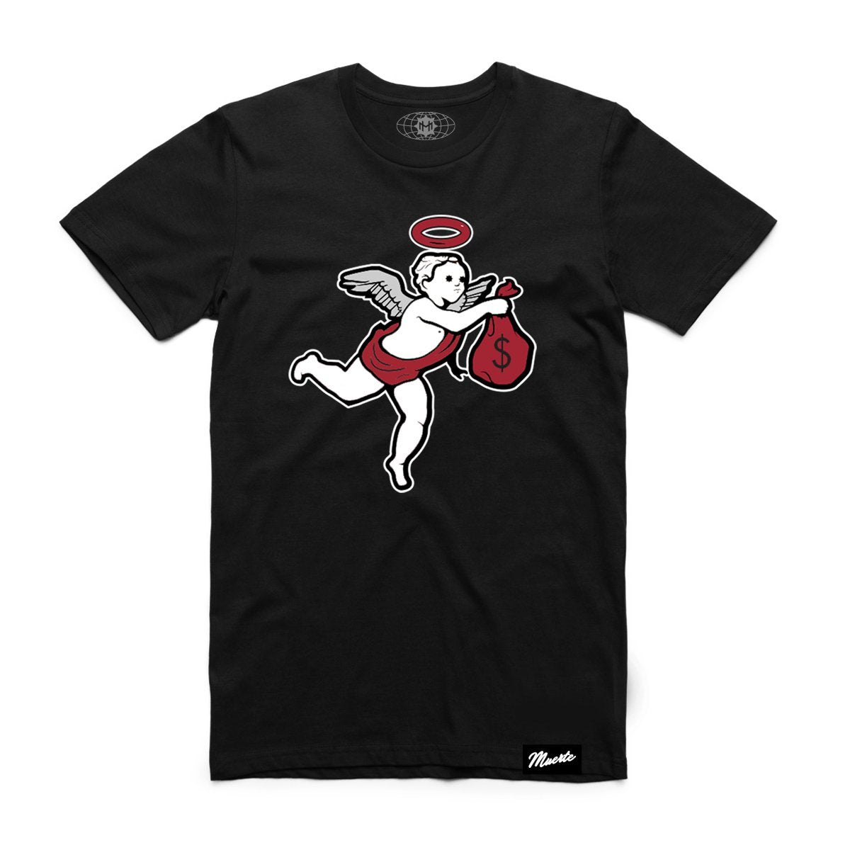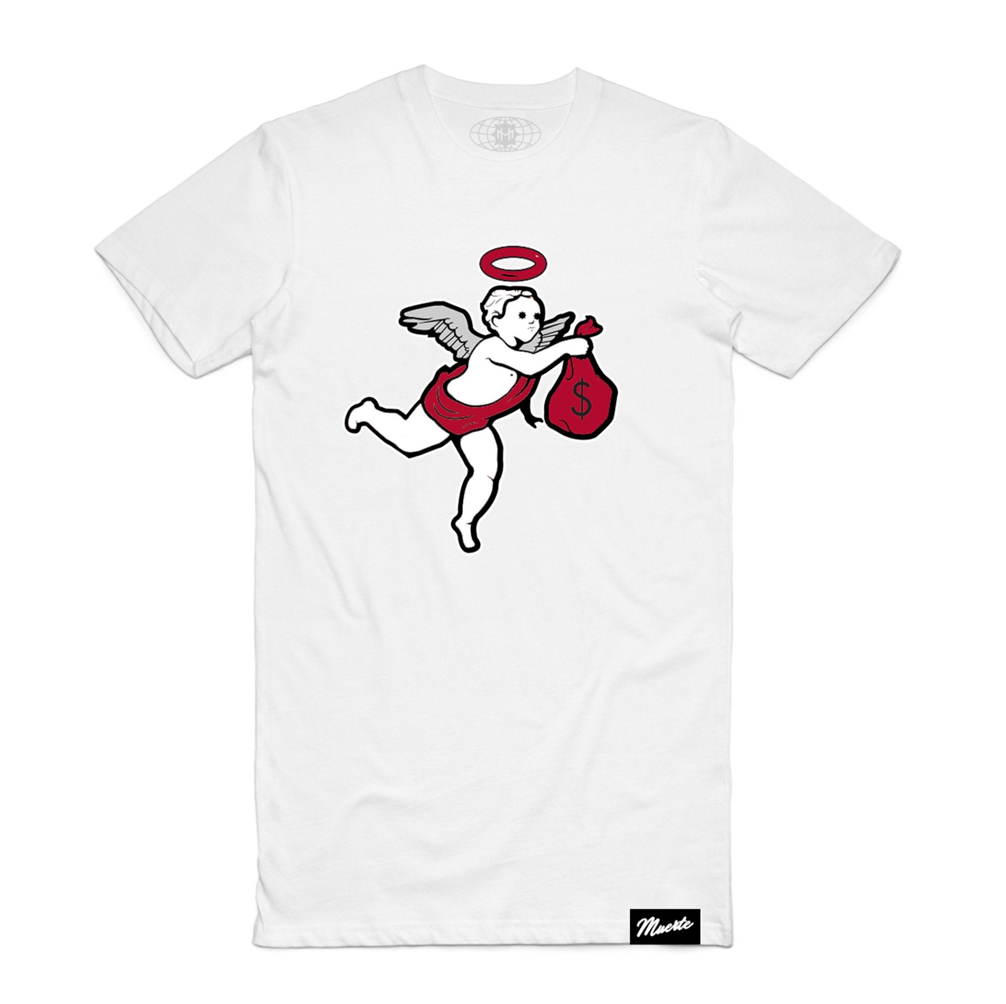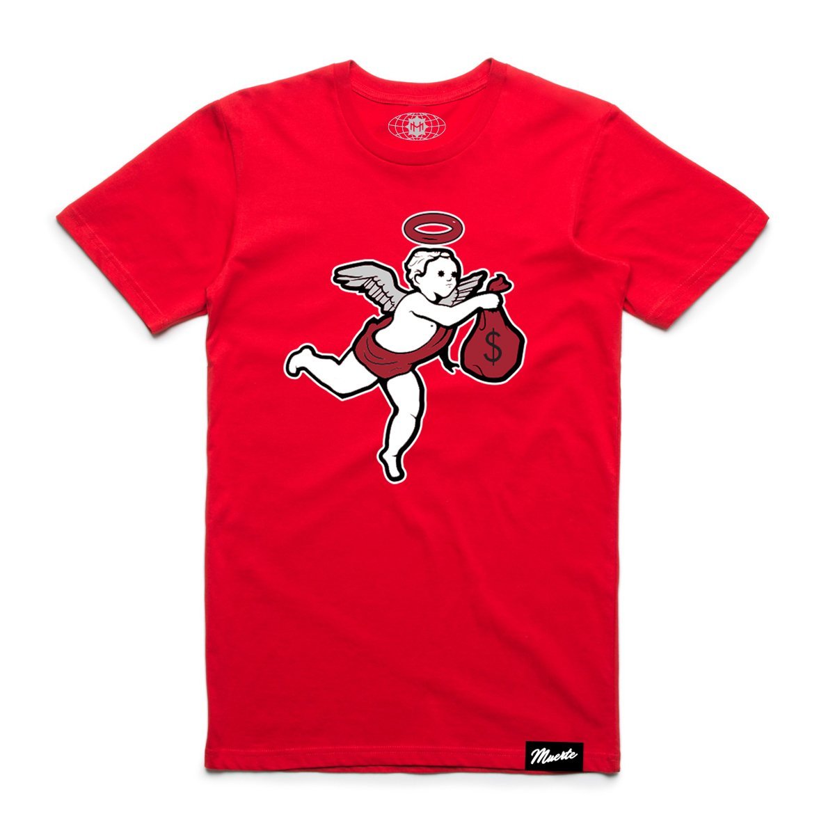 5.5oz premium ringspun cotton tee with chenille patch angel logo on the front. Printed neck label and woven Muerte label on the bottom hem.
