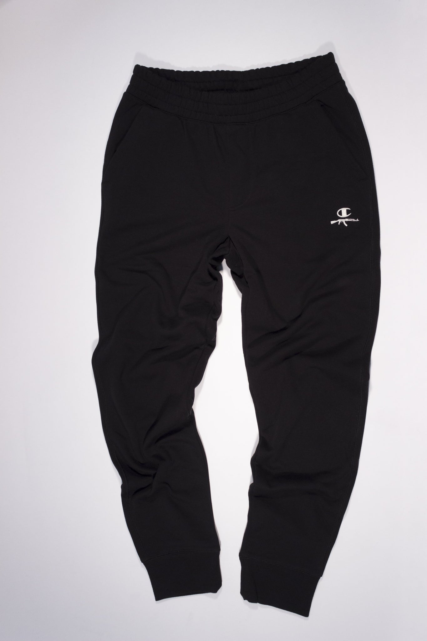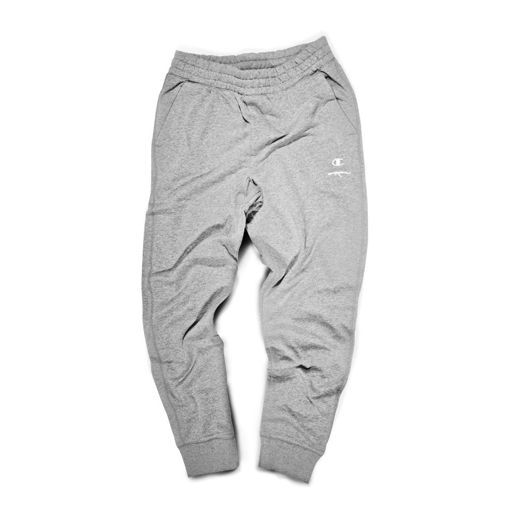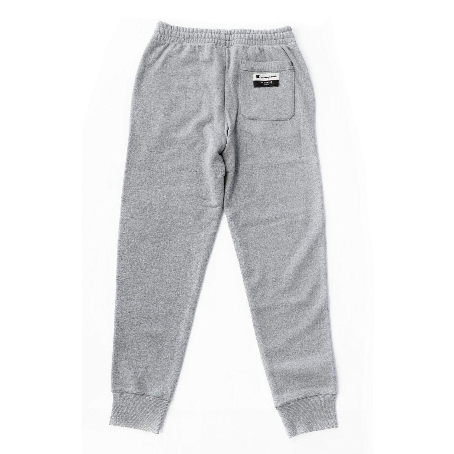 8.5oz premium 80/20 cotton/poly fleece joggers. 3-end 100% cotton fleece face. 2x2 rib cuffs. Side-entry pockets with jersey-lined pocket bags. Triple-needle stitching on outseam and stitched mock fly. Self-fabric waistband with encased elastic and natural flat woven drawcord with turned and tacked ends. Back pocket with ribbed welt jock tag. Champion "C" logo and AK embroidered on left hip